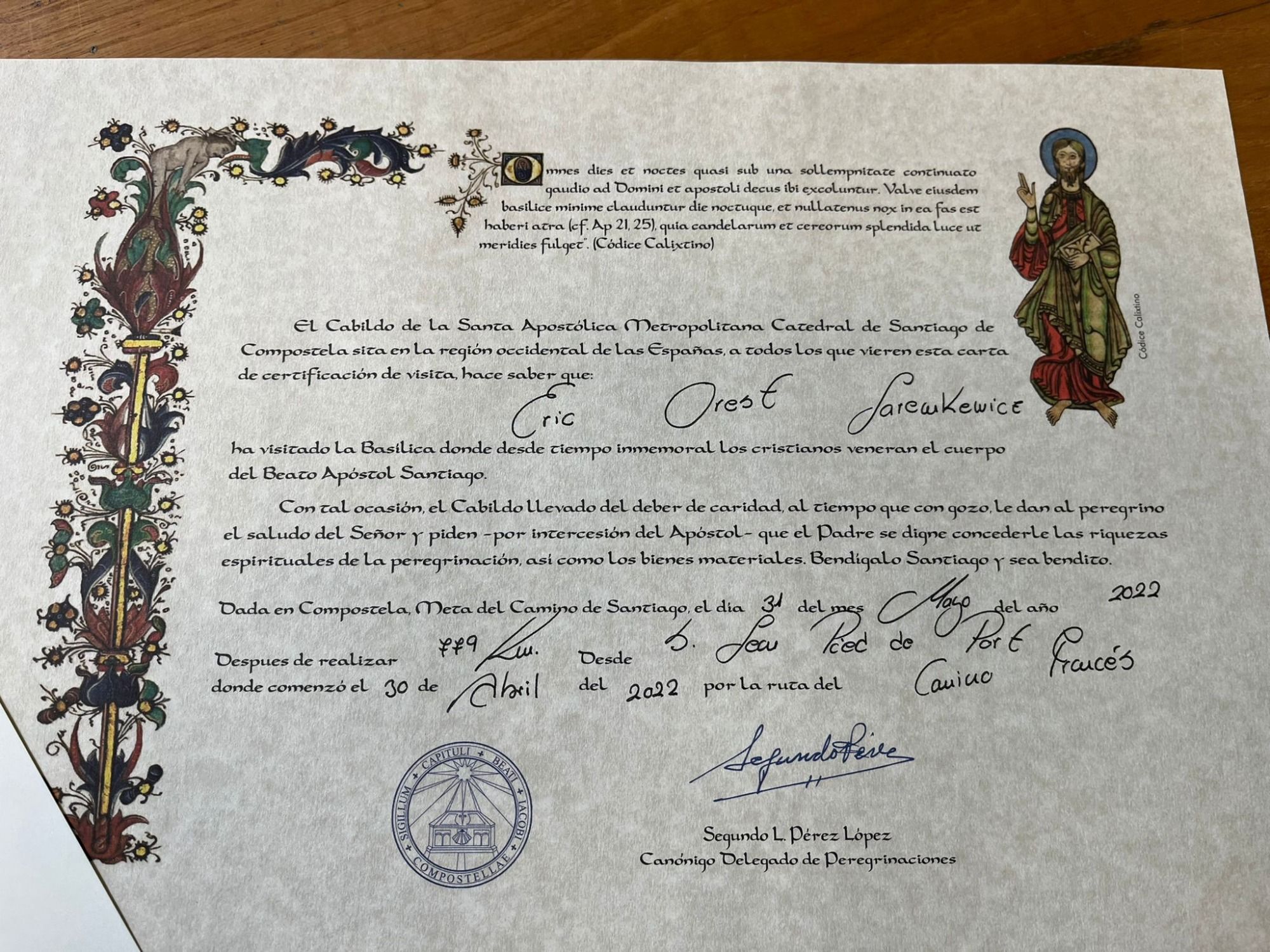 Heute ging es um 06:50 Uhr wieder los. Nachdem ich das Kloster in Roncesvalles verlassen habe, bin ich an dem Ortschild mit 790km in Richtung Santiago stehen geblieben und habe jemanden gefragt, ob er mich fotografieren könnte. Ja, schönes Foto. Und los nach Burguete, dort eine Pause mit Kaffee und Croissant. Leider ist die Verabredung mit Octavia nicht zustande gekommen, also alleine weiter nach Zubiri. Toller Weg. Schon wieder Berg Hoch. Nein, ich will nicht aber ich muss da wohl durch. Jeden Tag eine gute Tat. Ich fand auf dem Weg eine Rosafarbene Jacke, die ich mitnahm. Nach einem halben Kilometer fand ich tatsächlich die junge Spanierin, die die Jacke verloren hatte. Sie hatte sich sehr über die Jacke gefreut. Auf dem Weg kurz vor der Unterkunft hat mich Octavia eingeholt, sodass wir den restlichen Weg zusammen gehen konnten. Dusche, Essen und ein Bier für 15€.